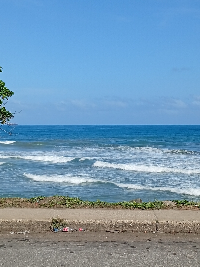 The image depicts a coastal scene in Puerto Cabello, Venezuela, under a clear, light blue sky with minimal, scattered white clouds. The horizon line is distinct, separating the sky from the ocean. The ocean water is deep blue, characterized by multiple parallel lines of white-capped waves advancing towards the foreground. A dark, indistinct vessel is visible on the left side of the horizon. In the immediate foreground, a dark gray asphalt road surface occupies the bottom portion of the frame, showing minor surface irregularities. This road is bordered by a concrete curb, behind which lies an elevated strip of land. This strip contains exposed soil, sparse green vegetation, and small rocks. Litter, specifically at least two plastic bottles (one red, one clear), is present on this elevated strip next to the curb. Beyond this strip, the terrain slopes down to the sea. A tree branch with green leaves partially enters the frame from the upper left corner. No people or specific actions are observed.