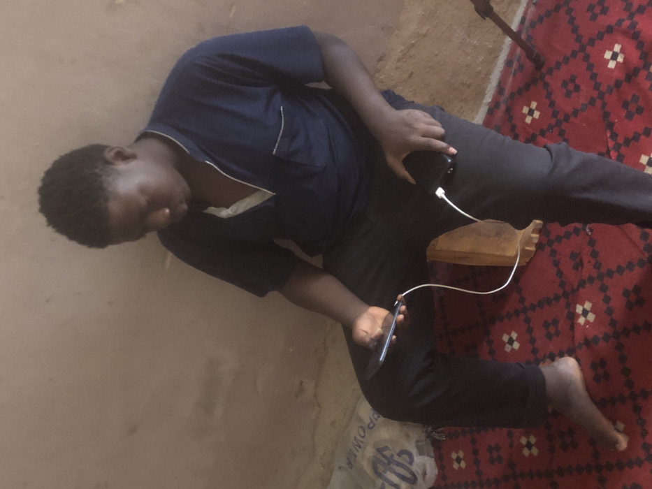 In Dutsinma B, Nigeria, a male individual is seated indoors, engaged with two electronic devices. The individual has dark skin and short, dark hair, wearing a dark blue short-sleeved collared shirt with a light-colored placket and dark trousers. His left foot is bare, resting on the floor. He is looking downwards, focusing on a dark-colored smartphone held in his left hand. A white charging cable extends from the smartphone to a black power bank held in his right hand, which appears to be resting on his right thigh or a small wooden object positioned between his legs. The immediate environment includes a light brown, unpainted wall in the background and a red rug with a black and white geometric pattern covering the floor. To the left of the individual, a white bag with the partially visible blue text "POWER" is present on the rug. An indistinct brown object or structure is partially visible on the far right.