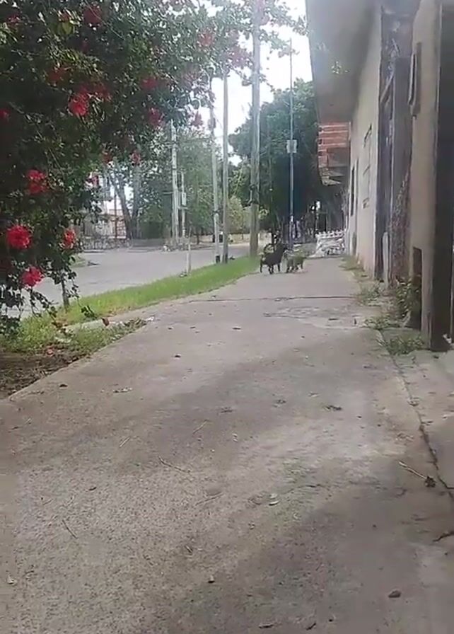 paved sidewalk with a building on the right and a tree with red flowers on the left. In the distance, two dogs, one black and one lighter in color, are interacting near a street corner. Utility poles line the street. The sidewalk is cracked in places, and there is some grass growing along the edge. The building has a closed door and some exposed brick.