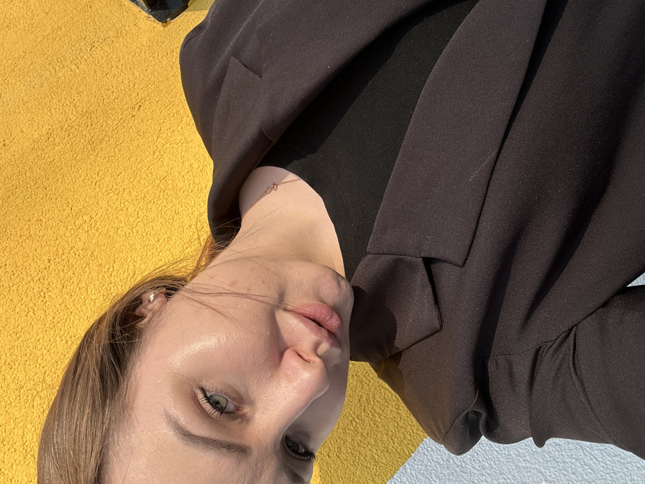 A medium close-up, angled portrait depicts a female individual in Pervomaysky, Russia. The subject, appearing to be a young adult, has light-toned skin, light brown hair, and green eyes, with her gaze directed towards the camera. She wears a dark, possibly black, blazer with notched lapels over a black top. A thin, rose-gold-toned necklace with small, interconnected circular pendants is visible on her neck, and a small, silver-colored stud earring is present in her right ear. The background is a textured wall, likely stucco, painted in two distinct sections: a bright yellow area occupies the upper right two-thirds, and a light blue section is in the lower left, separated by a diagonal line. The scene is illuminated by strong, direct sunlight, casting clear highlights on the subject's skin and accentuating the wall's texture.