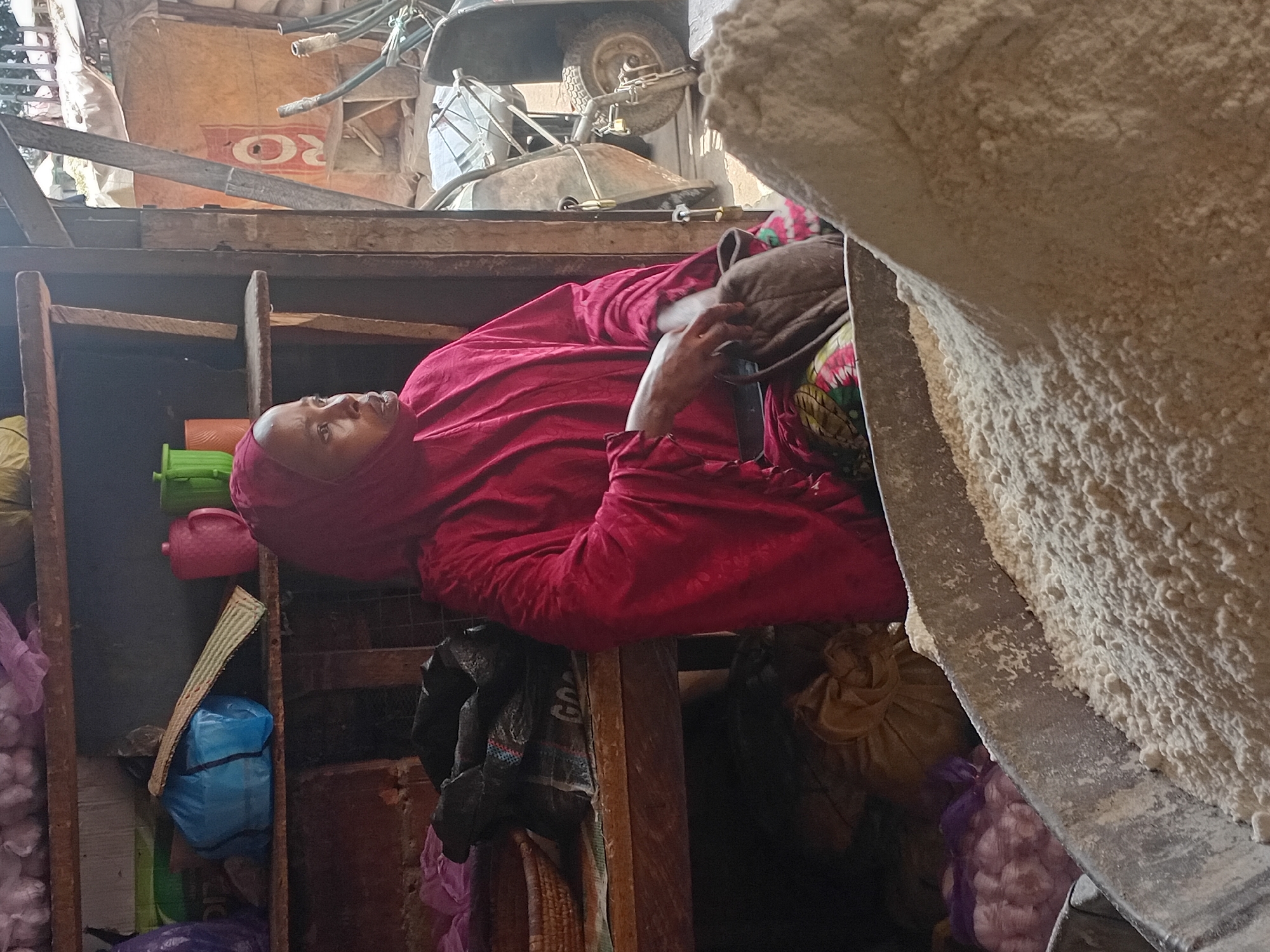 A woman wearing a red headscarf and clothing rests within a wooden shelf-like structure, potentially in a market or storage area. The structure contains various items like plastic containers, woven mats, and bags filled with goods. To the side, a large container filled with a white, powdery substance, likely flour, is visible. In the background, there's a view of a wheelbarrow and other equipment. The environment appears to be a busy, possibly cluttered, commercial space. It is presumed this is a market in Abuja, Nigeria.