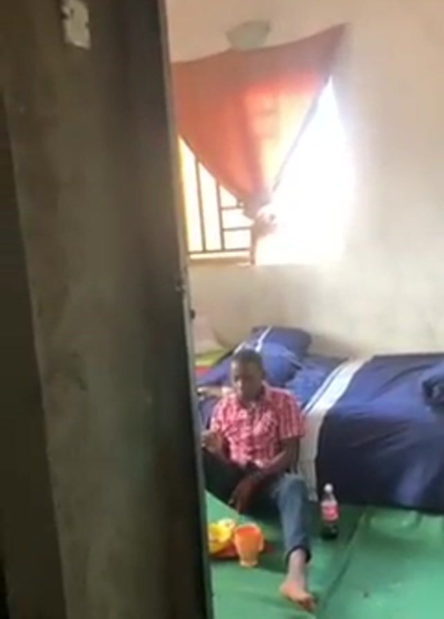 The camera pans into a sparsely furnished room. A young boy, dressed in a red and white plaid shirt and jeans, sits on the floor with his legs stretched out. He looks directly at the camera, arms outstretched to his sides. A plate with food and a yellow plastic cup sit beside him. A bottle of Coca-Cola sits on the green floor beside him. Behind him is a bed with blue bedding. Sunlight streams in through a window covered with a sheer peach curtain. The walls are white.