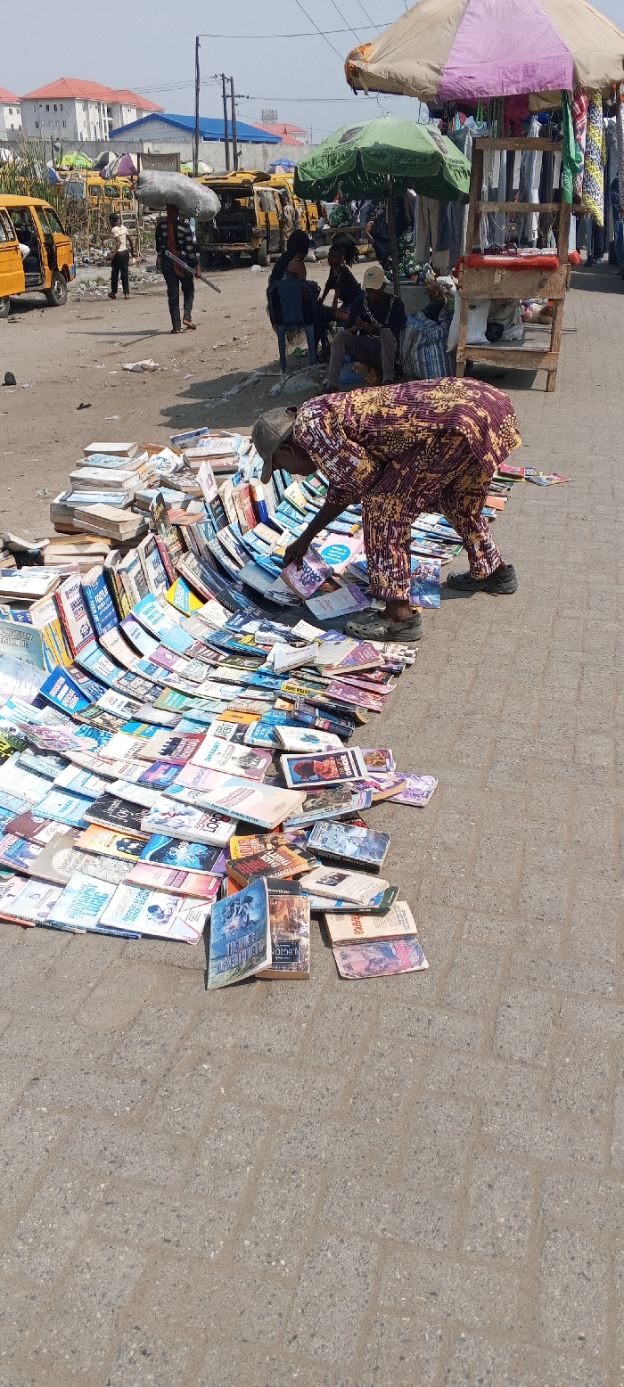 The image displays an active outdoor street market scene in Awjaw, Nigeria, under a clear daylight sky. In the foreground, a large collection of paperback and hardcover books are laid out across a grey interlocking paver block surface, forming multiple scattered piles and linear arrangements. An adult male, dressed in patterned purple, yellow, and red traditional attire consisting of a long-sleeved tunic and trousers, a dark baseball cap, and dark slip-on shoes, is bent over the books, appearing to sort or arrange them with his hands. To the right of the central figure, a market stall with a wooden shelving unit stands beneath a beige and purple striped umbrella, with textiles hanging behind it. Adjacent, a green umbrella shades several individuals, one of whom, wearing a dark cap, is seated and engaged with a mobile device. In the midground, a yellow commercial minibus with an open door is parked on the left. Further back, another individual walks carrying a large light-colored sack on their head while holding a stick. Multiple other yellow minibuses and various market activities are visible in the background, set against residential or commercial buildings with red and white roofs, utility poles, and overhead wires.