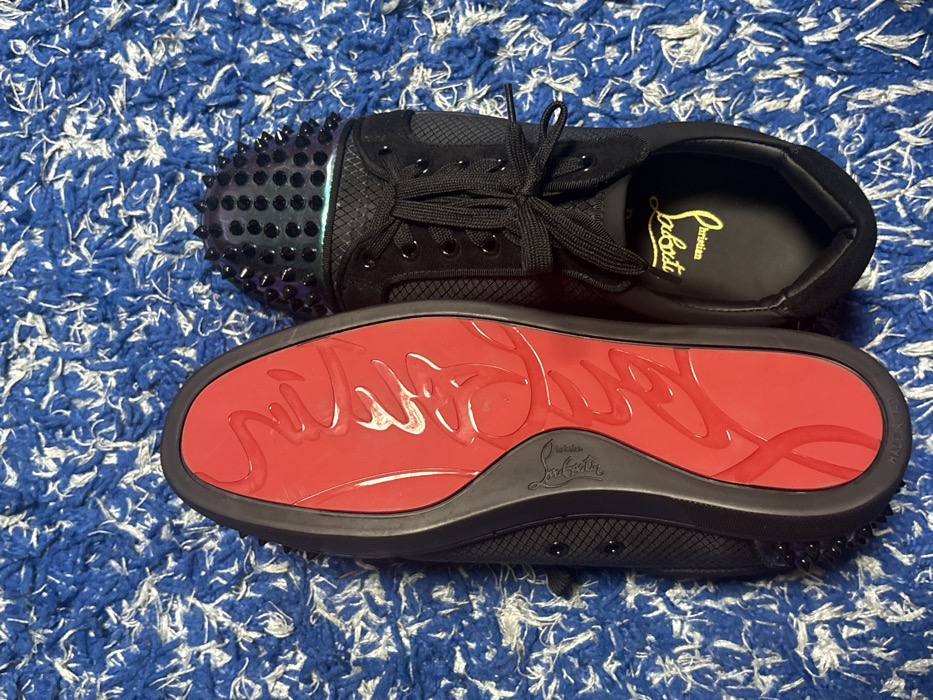 - "Two black Christian Louboutin sneakers are positioned on a blue and white shag rug in an indoor setting within Gorna Oryahovitsa, Bulgaria" by FM-DSrVq2, licensed under CC BY 4.0
