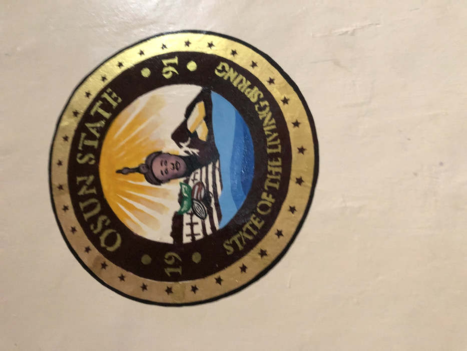 A circular emblem depicts a stylized scene: A person with headgear holds an object, positioned against radiating golden lines and black and white stripes. A blue area is adjacent. Encircling this, "OSUN STATE" and "STATE OF THE LIVING SPRING" are inscribed in gold letters on a dark background, separated by the numbers "19" and "16". A gold band with gold stars outlines the circle.