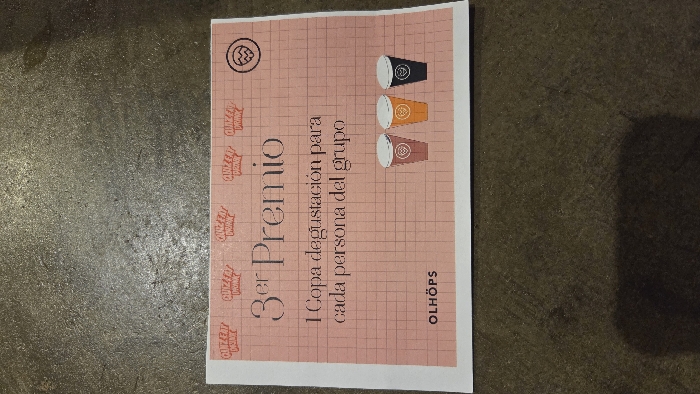 A coupon or promotional item with a pink grid pattern background advertises "3er Premio" (3rd Prize). The prize is "1 Copa degustación para cada persona del grupo," which translates to "1 tasting cup for each person in the group." Three cups with the brand logo are stacked vertically. The text "GUNZEAT ONLY" is repeated along the side. The brewery name "OLHÖPS" is at the bottom.