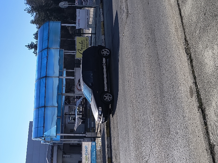 The image captures a static outdoor scene on a clear, sunny day at bul. "Aprilsko vastanie" 21, Razgrad, Bulgaria. In the foreground, a cracked and worn asphalt road surface is visible. A dark-colored, likely black, five-door hatchback (resembling a Volkswagen Polo) with silver multi-spoke alloy wheels and a horizontal light-colored decal on its lower body is parked diagonally, facing left, on the right side of the road. Behind the vehicle, a narrow paved curb separates the roadway from a commercial property. This property features a prominent structure with a bright blue, translucent, corrugated plastic roof canopy supported by white pillars, characteristic of a car wash facility. To the immediate left of this canopy structure, a building with a grey facade displays a blue and white "CashCredit" sign. Further to the right, behind a black metal fence, multiple commercial banners are visible, including a yellow one for "Столичен такси" (Stolichen Taxi) with the phone number "555 149" and a white banner for "CrediYes". Evergreen trees are present in the distant background on the right side. No individuals are distinctly visible within the frame.