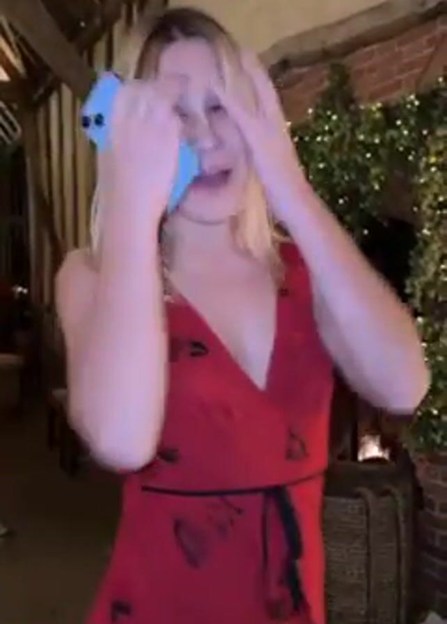 A woman is recording herself. She's wearing a red V-neck dress with a black waist tie. The dress has a pattern of black markings on it. She smiles at the camera and says, "So, I just changed outfits." She spins around to show off the dress. She is indoors in a wooden structure with brick walls. There is green foliage on one wall with lights.