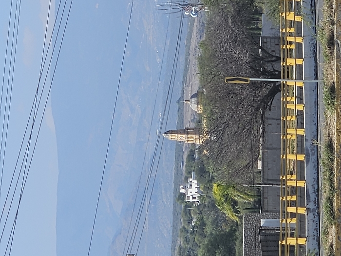 A cityscape features a tall, yellow church with a distinctive dome and spire in the distance, against a backdrop of blue mountains and sky. Utility lines crisscross the foreground. A roadside barrier painted in yellow stands alongside a paved road. Trees and other buildings are scattered throughout the scene.