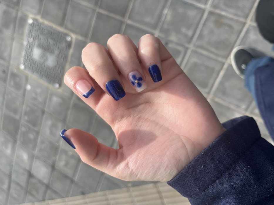 The image presents a fair-skinned left hand, positioned palm-upward, under bright natural light. The nails are manicured with dark blue polish. The thumb and index finger display a French tip style with dark blue tips over a clear or light pink base. The middle and pinky fingers are fully painted in solid dark blue. The ring finger features a clear or light base with a dark blue four-petal flower design centered by a small gold dot. A dark blue long-sleeved garment, likely a jacket or sweatshirt, is visible on the wrist and lower forearm. The background consists of light gray rectangular paving stones laid in a grid pattern. A square metal utility cover with a textured surface and four visible fasteners is present on the ground in the upper right. Partially visible in the lower right foreground are a dark shoe and dark blue trousers or jeans. The scene depicts an outdoor urban setting in the city of Valencia, Spain.
