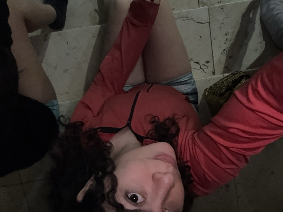 An indoor scene depicts two individuals, primarily from an elevated, downward-angled perspective. In the foreground, a person with dark, curly hair and light skin is positioned, looking directly at the camera with a slight smile. This individual wears a red long-sleeved top featuring a black vertical zipper detail on the chest and light blue denim shorts. To the upper right, partially obscured, a second individual is visible, showing their lower torso, legs, and feet. This person wears dark, possibly black, clothing on their lower body and dark shoes. Both individuals appear to be seated or crouched on a light-colored tiled floor, which exhibits dark, irregular patterns consistent with natural stone or veined ceramic. A dark-colored object with illegible text, possibly a bag, rests partially visible between the foreground individual's left arm and leg. The lighting is localized, illuminating the foreground subject, suggesting an artificial light source in a dimly lit setting. No discernible architectural features or unique landmarks are present to specify a precise location within the city of San Fernando del Valle de Catamarca, Argentina.