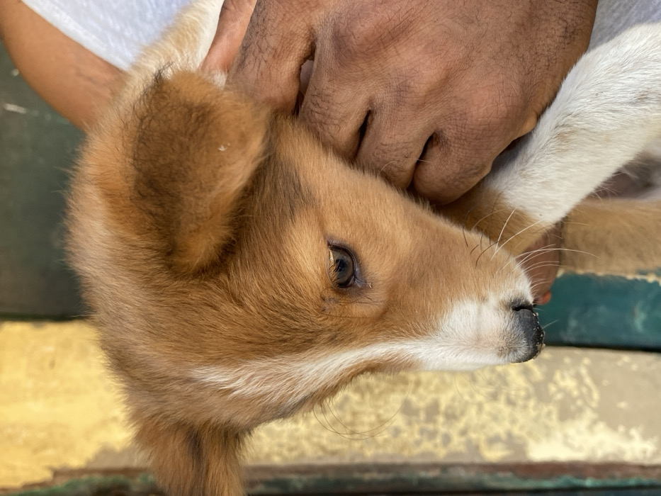 The scene is situated in the city of Narayi, Nigeria, though specific landmarks are not discernible from the image. A reddish-brown and white puppy is held by a person's hands in a close-up, portrait-oriented shot. The puppy, viewed from its left side and front-facing, exhibits a white blaze running down its forehead and muzzle, with reddish-brown fur on its ears, head, and body. Its dark eyes are directed downwards and slightly to the left. The puppy's black nose shows minor specks of light-colored debris. White fur is visible on its chin, chest, and a portion of its front right paw. The hands holding the puppy have a darker skin tone, with fingers curled around its midsection and supporting its underside. A segment of a white garment, likely a shirt, is visible on the person's right side beneath the puppy. The background features an out-of-focus, textured yellowish surface on the upper left, possibly a wall, and a vertical strip of faded greenish-blue on the lower left, potentially part of a doorframe or structure. Bright, natural light illuminates the subject from the left.