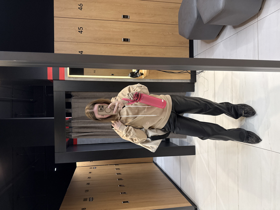 A person takes a mirror selfie in a locker room. They wear a beige hoodie, black pants, and shoe covers. The background features wooden lockers with numbers and a black frame around a dressing area. The floor is white tile. They hold a phone in one hand and a pink water bottle in the other.
