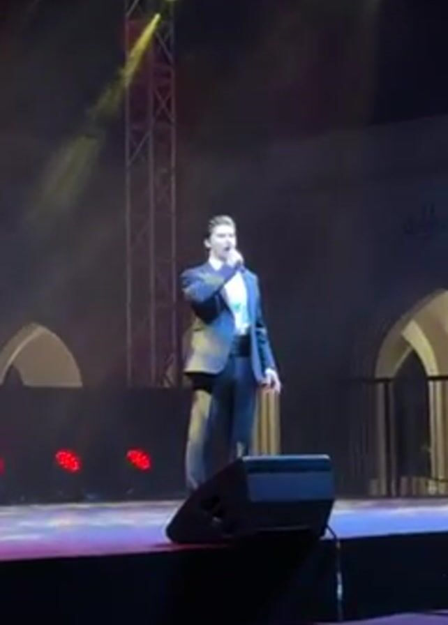 A man in a black tuxedo is singing on a stage. The stage has spotlights on it, and there is a speaker in front of him. Behind the stage, there is a building with arched windows. The man has short brown hair and a light complexion. He is holding a microphone in his right hand and singing into it. He is facing forward and appears to be performing for an audience.