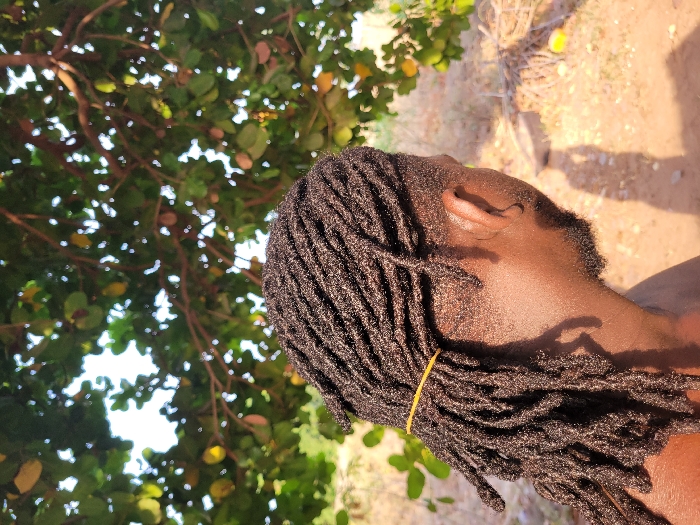 person with dark skin and locs under a tree. The locs are gathered in the back with a yellow rubber band. The tree has green leaves and yellow fruit. The person's ear and the back of their neck are visible. The background is blurred, but appears to be a dry, grassy area. The lighting is bright, possibly from sunlight.