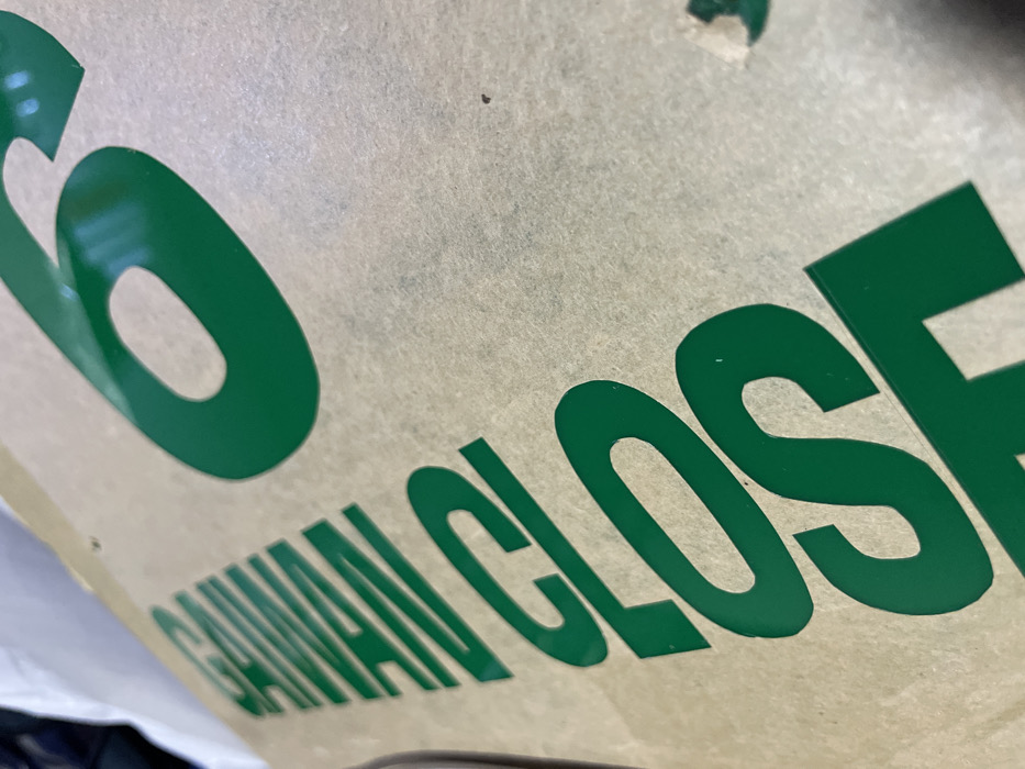 A close-up shot features green lettering on a textured, light brown surface. The text includes a large "6" and the word "CLOSED" in capital letters. The angle of the shot suggests the text is on a sign or a package. The lighting creates reflections on the letters, highlighting their glossy finish, and casting subtle shadows.