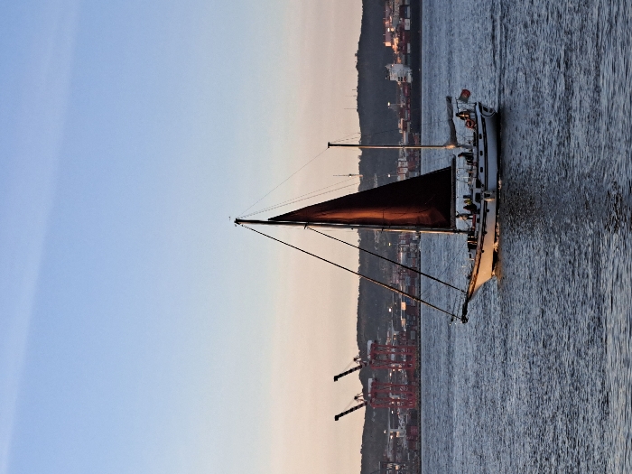 - "A white-hulled sailboat with a single mast and a deployed dark reddish-brown mainsail is underway on the Tagus River, near Almada, Portugal" by FM-jYNYq2, licensed under CC BY 4.0