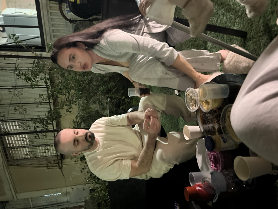 An outdoor evening scene in Kiryat Yam, Israel, depicts three individuals gathered around a low, dark round table on artificial green turf. In the center-left, a bald man with a beard, wearing a light-beige short-sleeved shirt and matching pants, sits with his hands clasped, looking downwards. To his right, a woman with long dark hair, dressed in a light-grey long-sleeved cardigan and matching pants, sits holding a clear plastic cup containing a dark beverage. Her mouth is open as if speaking, and she wears light-colored fuzzy slippers. A third person's legs, also in light-colored pants and fuzzy slippers, are visible in the lower right foreground, partially obscuring the table. The table is laden with multiple food items. These include several clear plastic containers holding various dips or salads, such as a red cabbage salad, a yellow dip (possibly hummus or mashed potatoes), and a grayish dip. A large, dark circular pan or bowl containing a dark, cooked dish is centrally placed. Additional items on the table include white plastic cups, a red pitcher, and a clear pitcher with a blue lid. In the background, a light-colored building wall is visible, featuring barred windows and green foliage from plants or bushes. The scene is illuminated by artificial light, suggesting nighttime or late evening.