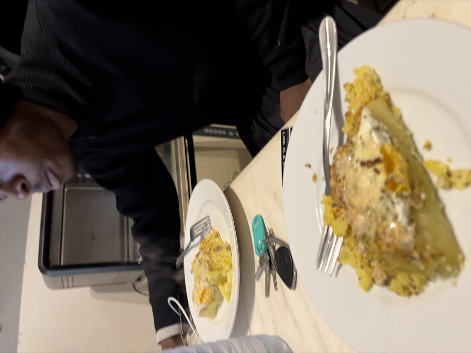 This image captures an indoor scene in Paris, France, featuring a person at a table during a meal. In the foreground, a white round plate holds a wedge-shaped slice of a baked dish, appearing potato-based, with a golden-brown and white-topped surface consistent with melted cheese or sauce. A silver fork and knife rest on this plate. In the mid-ground, a dark-skinned individual wearing a black turtleneck sweater is partially visible on the right, positioned in profile facing left. Their mouth is slightly open, and their left arm is extended towards another white round plate. Steam is visibly rising from the food on this second plate, which also contains a similar wedge of the baked dish with a fork resting on it. Between the plates, a set of keys, including a teal-colored key fob and a black oblong key fob, lies on the light-colored, possibly marble or laminate, tabletop. A translucent water bottle is partially visible on the far left. The background reveals a kitchen setting with a compact toaster oven or small oven on a counter, backed by a light-colored wall, and a metallic appliance below.