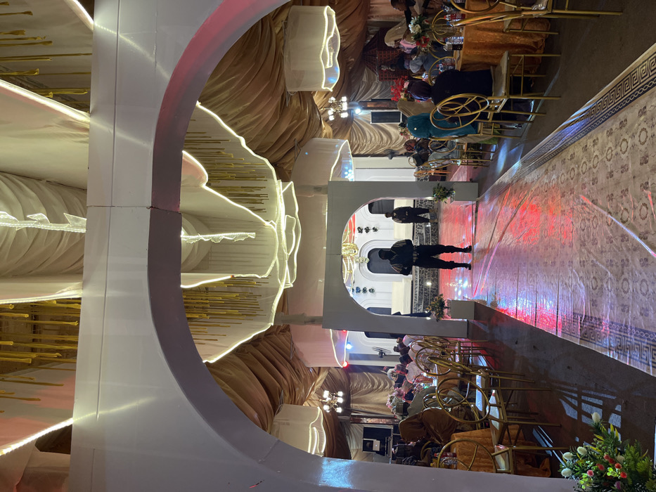 A decorated interior, possibly for a wedding or formal event, features golden chairs arranged on either side of a patterned floor. Two guards stand in the middle of the path, possibly for security. The ceiling is draped with elaborate decorations, including white fabrics and hanging lights, creating an elegant and festive atmosphere. Archways with built-in lighting frame the scene, enhancing the depth of the space.