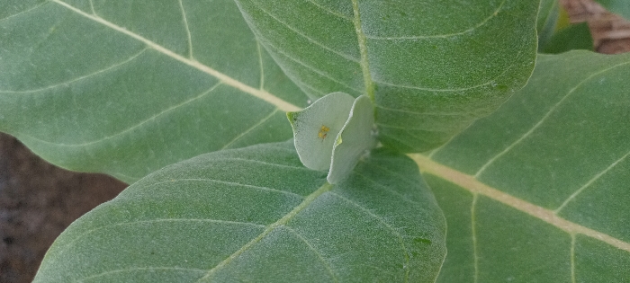 In the city of Unknown, Unknown, a vertical close-up photograph captures a section of a plant, likely outdoors, featuring multiple broad, ovate leaves. The leaves are dull green, appear textured or slightly fuzzy, and exhibit prominent lighter green or yellowish-green venation. Centrally positioned among the larger leaves is a smaller, lighter green, partially unfurled bud or new leaf formation. A minute, yellow-bodied insect is observed resting on the inner surface of this central bud. The background is out of focus, appearing as an indistinct dark brown and green blur, suggesting a shallow depth of field. Natural, diffused light illuminates the scene.
