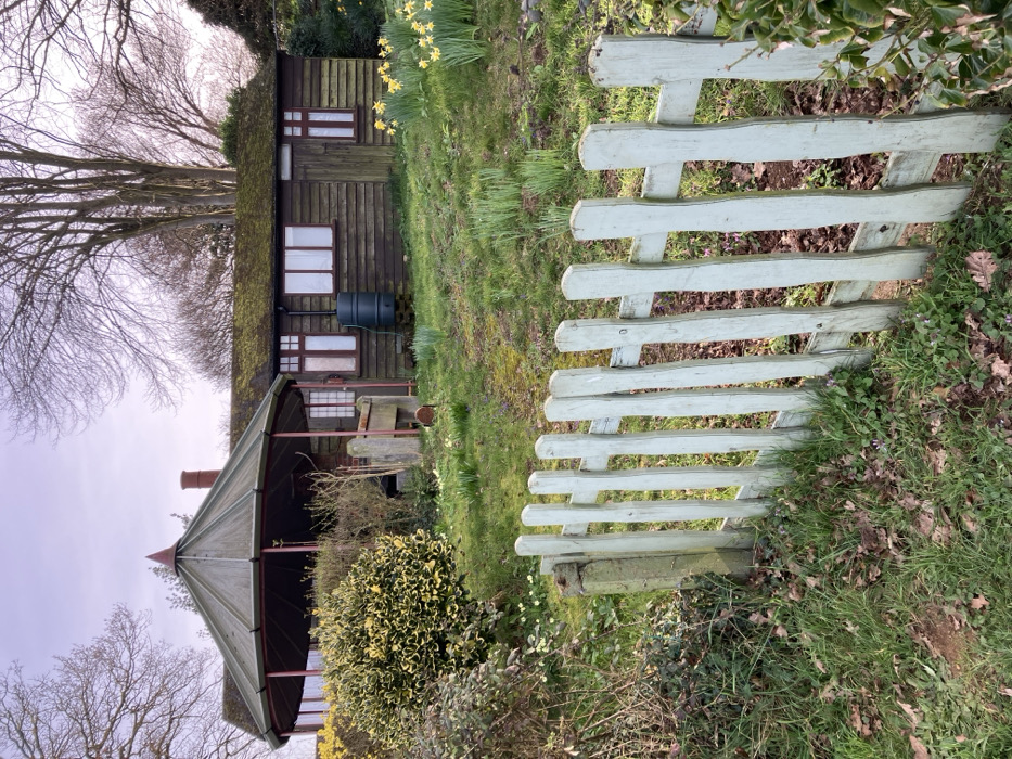 The image depicts a rural garden scene, likely in East Suffolk, United Kingdom, under a pale, overcast sky suggesting late winter or early spring conditions. No individuals are present. In the foreground, a low, weathered picket fence, painted light green and exhibiting irregular wooden slats, spans horizontally across the lower frame, separating the viewer from the main scene. The ground immediately beyond the fence is covered with dry leaf litter, sparse grass, and small, emerging purple and white flowers. The midground features a gently sloping grassy area that leads up to a collection of structures. On the left, a variegated evergreen shrub with yellow and green foliage is prominent. To its right, closer to the structures, are several smaller, bare deciduous shrubs and two reddish-brown, upright wooden posts. On the right side of the grassy slope, numerous yellow daffodils are in bloom among developing green shoots. In the background, two main structures are visible. To the left is an octagonal gazebo-like building with a dark, conical roof topped by a small spire. Its supporting framework appears to be painted a dark reddish-brown. Adjacent to and behind this, positioned centrally in the upper midground, is a single-story wooden outbuilding. This structure features horizontal dark brown timber cladding and a low-pitched roof heavily covered in green moss. It has multiple rectangular windows with reddish-brown frames: a smaller window on the far left, a larger one with three vertical panes further right, and another similar larger window towards the right. A dark green water butt is visible on the exterior wall beneath a white downspout between the first two windows. To the far right of the building, a wooden door with a vertical window pane is discernible. A reddish-brown chimney stack rises from behind the octagonal structure. The overarching environment includes bare deciduous trees in the far background and upper portion of the frame, indicating a leafless state typical of the season.