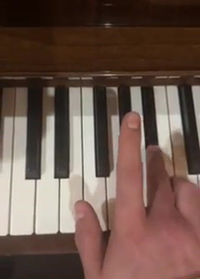 A close-up shot shows a hand playing a piano