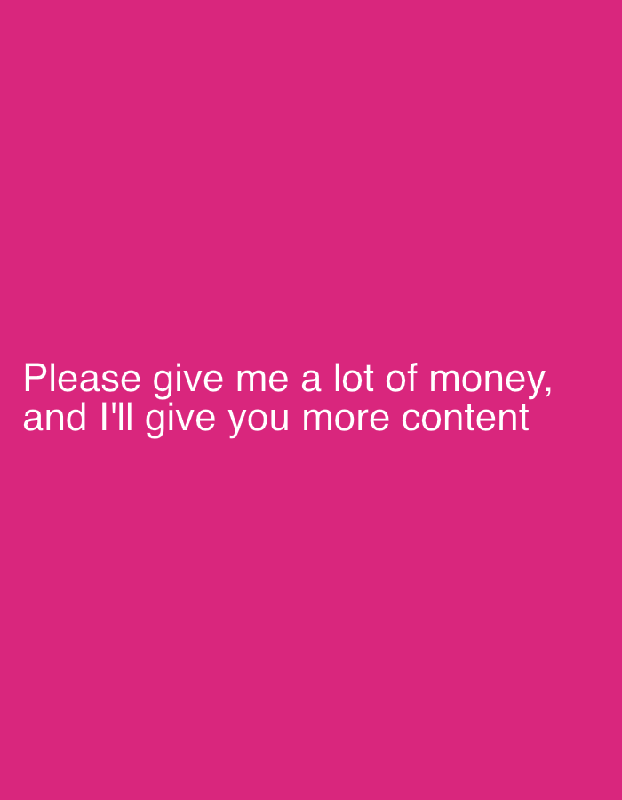 The image is a digital graphic featuring white sans-serif text centered against a uniform magenta background. The text states: "Please give me a lot of money, and I'll give you more content". No individuals, physical objects, or specific actions are depicted. The composition lacks any visual elements to determine a physical location within the city of Chaikovsky, Russia, or any other geographical area; it is an entirely textual and color-based digital artifact.