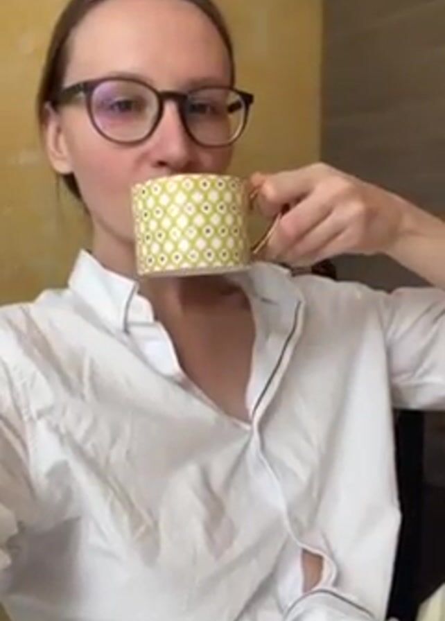 woman with light hair, wearing glasses and a white shirt, drinking from a yellow and white patterned mug with a gold handle. She is indoors, in front of a yellow wall, and appears to be in a relaxed setting. The camera is positioned at eye level, and the focus is primarily on the woman and the mug. After taking a drink, she holds the mug over her head, obscuring her face with its pattern. The camera remains relatively static throughout the brief video.
