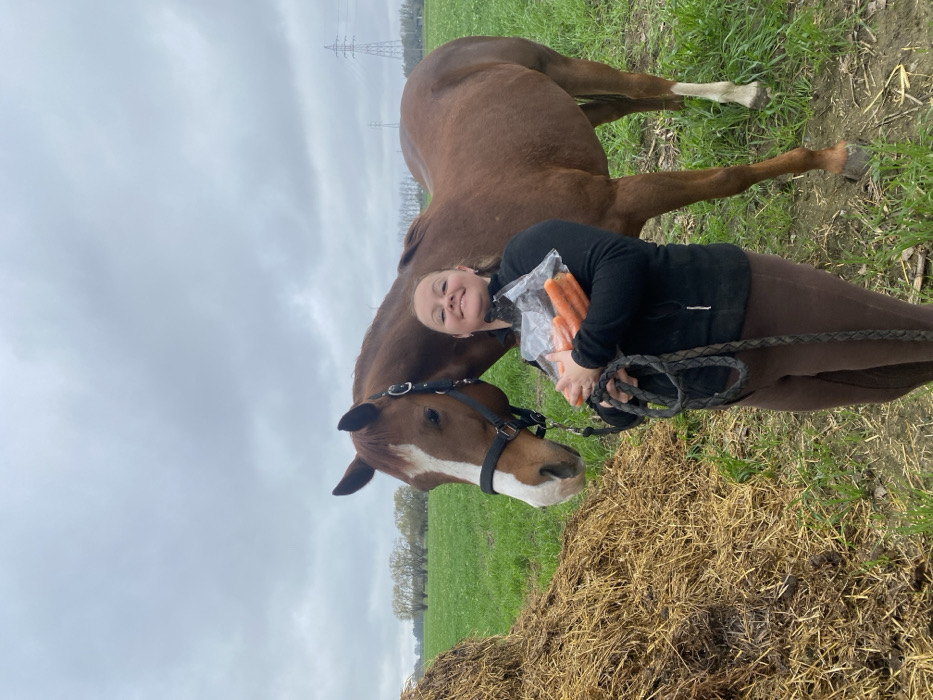 An outdoor scene in Estaimpuis, Belgium, captured under an overcast, light grey sky. A single adult female stands slightly right of center, smiling towards the camera. She wears a black long-sleeved top and dark brown riding pants. In her left arm, she holds a clear plastic bag containing approximately six large orange carrots. Her right hand grasps a black braided lead rope, which extends to a brown (bay) horse positioned immediately to her right. The horse has a prominent white blaze on its face and white socks on its lower legs, wearing a black halter, and is oriented with its head facing left. To the far left of the frame, a substantial, irregularly shaped mound of golden-brown hay or straw is present. The background features a green grassy field, with a distant line of leafless deciduous trees visible on the left horizon. A large metal electricity pylon and associated power lines are discernible in the far background on the right.