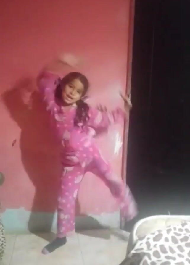 A young girl wearing pink pajamas is dancing in a room with a pink wall. She has her hair in pigtails. She raises her arms up and down as she moves. There is a bed with a leopard print cover to the right of her.