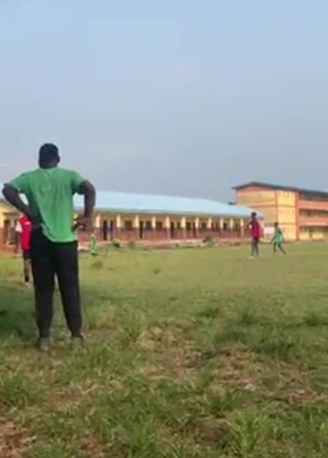 The video depicts a group of people playing soccer on a grassy field. Several players, some wearing red and others green, are spread across the field, kicking and chasing a ball. A man in a green shirt and black pants is standing on the edge of the field, watching the game with his hands on his hips. In the background, there is a long, single-story building with a blue roof and yellow and brown walls. The sky is overcast. The camera follows the action of the soccer players as they move across the field.