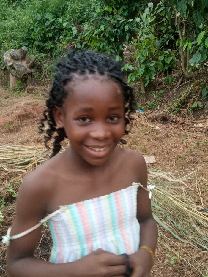 A young girl with dark skin and braided hair smiles at the camera. She wears a striped, off-the-shoulder dress and a thin bracelet on her right wrist. Her surroundings consist of a grassy area with scattered sticks and foliage. Behind her, a dense green forest creates a natural backdrop. The lighting suggests an outdoor, possibly overcast, environment.