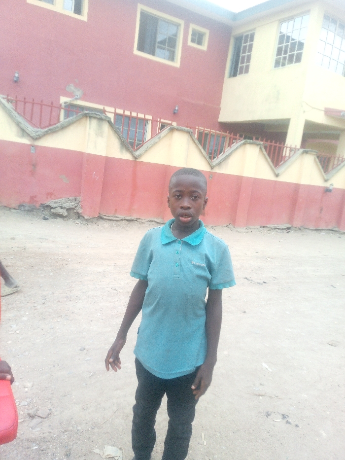 A young boy stands centered in the image, wearing a teal polo shirt and dark pants. Behind him, a two-story building exhibits a combination of red and yellow paint. A fence with decorative, triangular concrete accents lines the lower portion of the building's facade. The setting appears to be an outdoor space with a dirt ground. The sky is overcast, casting a soft, diffused light.