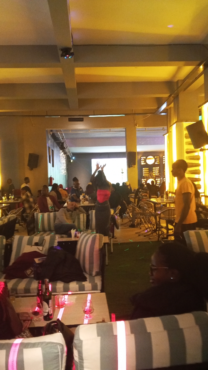 A busy restaurant or bar interior. People are seated at tables and on striped couches. A woman stands with her arms raised. A man in a yellow shirt stands to the right. The lighting is warm and slightly dim. There is a disco ball on the ceiling and green laser lights are scattered across the floor. Drinks are on the tables.