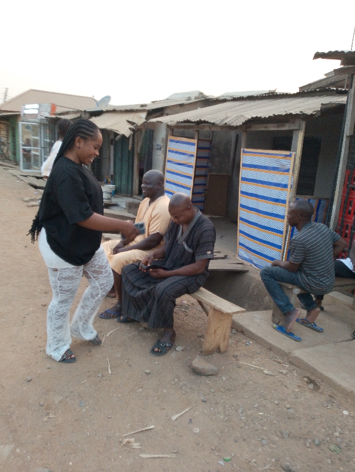 A woman in a black shirt and white pants hands an item to a man in a yellow shirt sitting on a bench. Another man beside him looks at his phone. A fourth person sits on the concrete, wearing a striped shirt. Two blue and white striped screens stand between them and the buildings behind. All are outside on a dirt ground, with some buildings in the background.