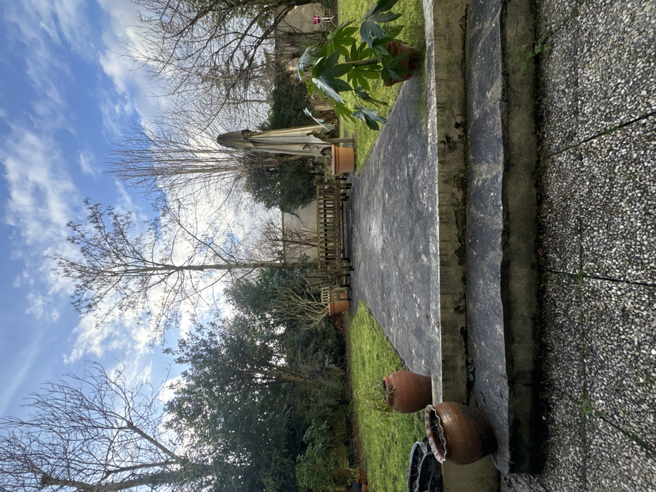 A garden path is captured on a sunny day, leading the eye towards a partially furled sun umbrella and a bench in the distance. Potted plants flank the path, adding color to the greenery. Bare trees frame a blue sky with scattered clouds. The textured, concrete steps and stone paving create a sense of depth and perspective.