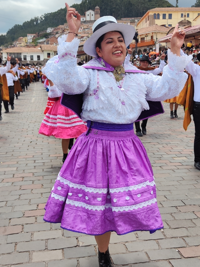 A female individual stands mid-movement on a cobblestone street in Cuzco, Peru, participating in a cultural procession