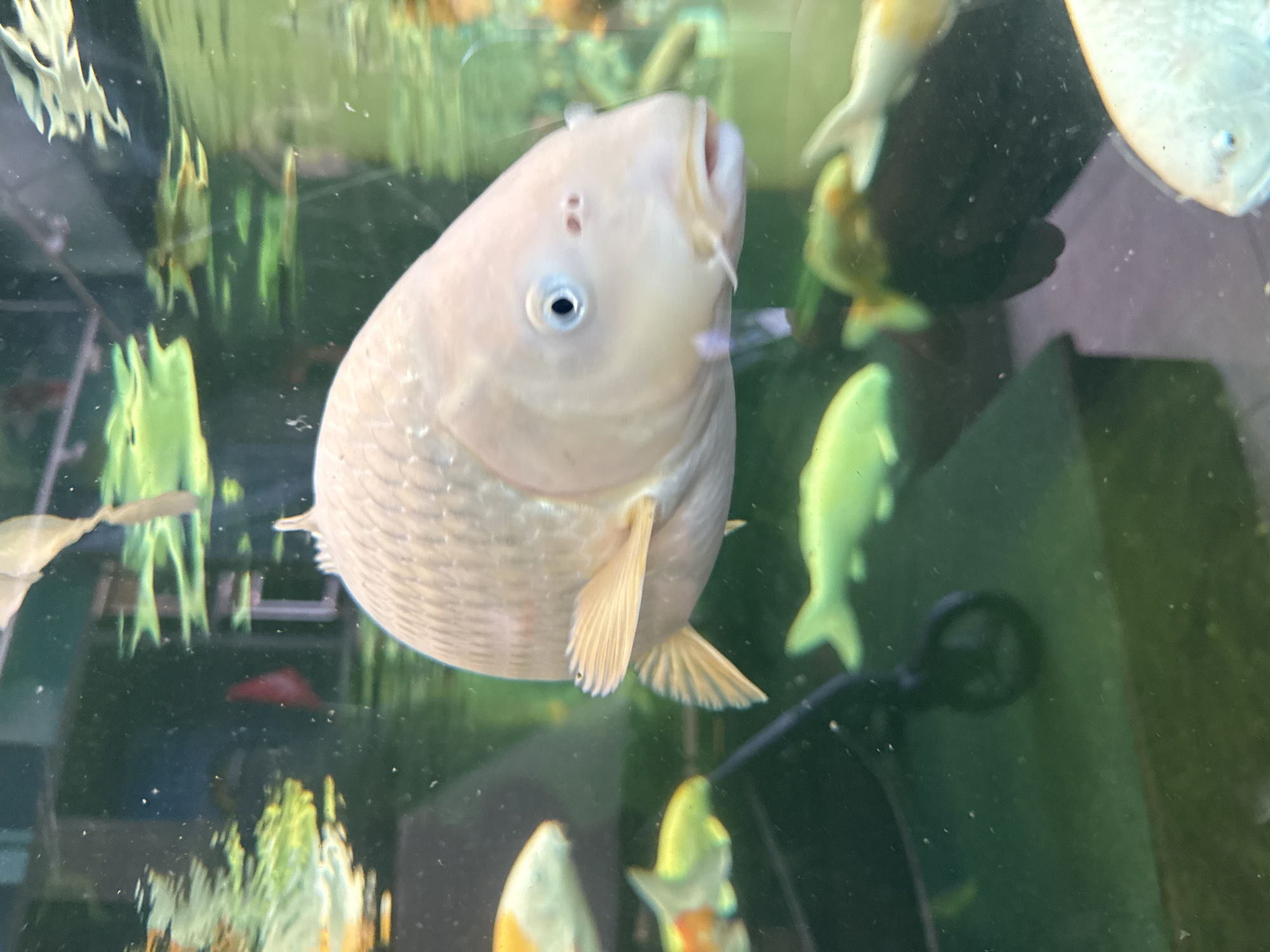 The scene depicts an underwater environment, likely an aquarium or pond, located in Geispolsheim, France. A large, pale-colored (off-white to cream) fish with discernible scales, barbels around its mouth, and an open gill is positioned centrally in the foreground. Its left eye, with a dark pupil and light iris, is visible and appears directed forward. Its pectoral fin is extended, and the dorsal fin is visible on its back. Multiple other fish are present within the water at various depths and levels of focus: a partially visible orange and white fish in the upper-left, a smaller greenish-yellow fish below the main subject, and several blurred fish shapes, some with orange and white markings, in the mid-ground and background. An artificial, light-green, fish-shaped object lies in the lower-middle background. The water exhibits particulate matter. Reflections of ambient light or structures are visible on the water's surface at the top. The background is predominantly dark and blurred, revealing a dark, wheeled object in the lower-left and a small, red, triangular object in the upper-left.