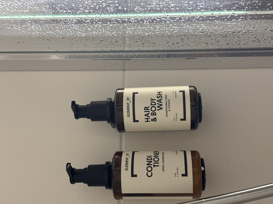 The image displays two amber-colored pump dispenser bottles, labeled "ELEMENT_RY," mounted on a white wall inside a shower stall