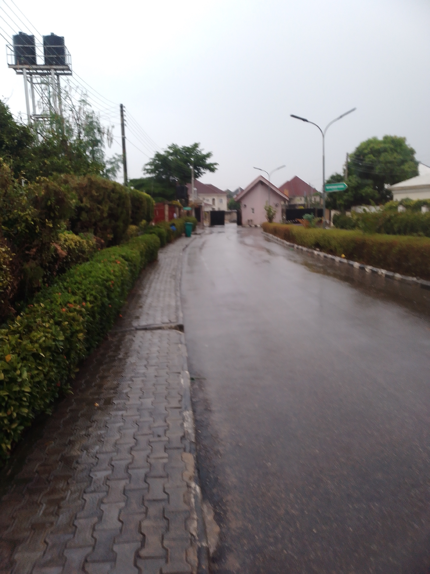 The image depicts a wet street scene in Kubwa, Nigeria. A paved sidewalk lined with a trimmed hedge runs along the left side of the road. The road itself is asphalt, appearing dark and reflective from the rain. In the background, there are residential buildings with different roof styles. A water tower stands tall on the left side of the street, and utility poles run parallel to the road. Street lamps are also visible. The sky appears overcast.