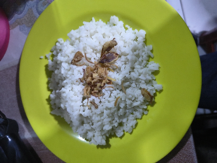 - "The image depicts a bright green, circular plastic plate filled with white, cooked rice, topped with a scattering of golden-brown crispy fried shallots" by FM-jT8hC2, licensed under CC BY 4.0