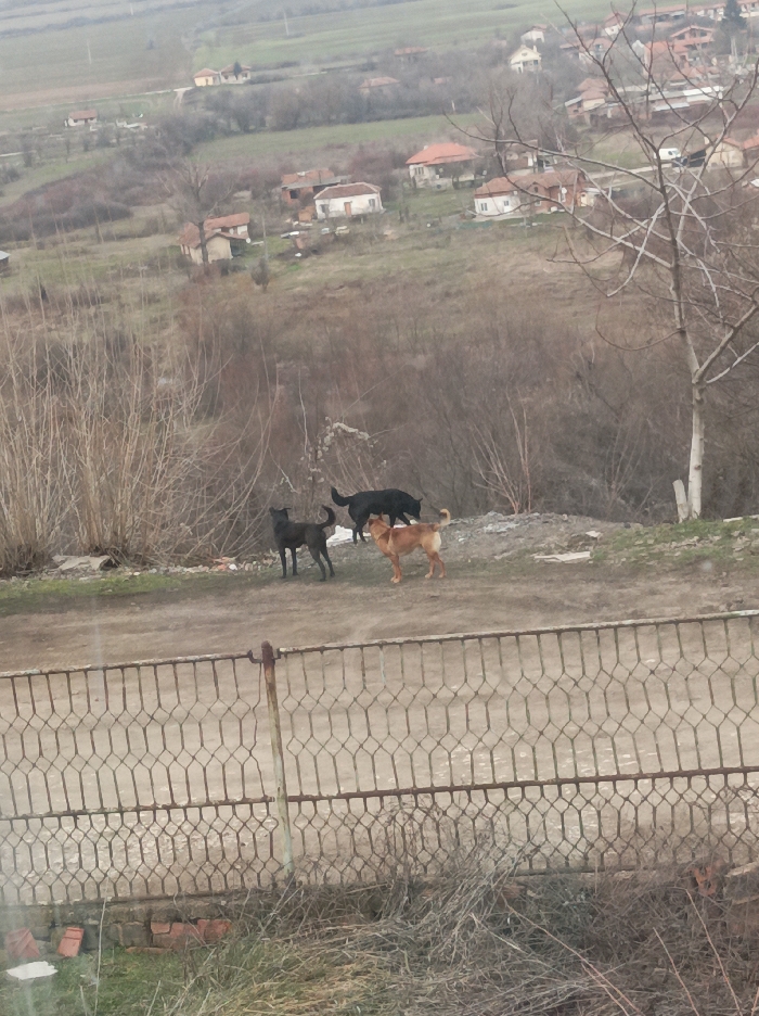 This image depicts an elevated outdoor scene in Cherven Bryag, Bulgaria, under an overcast sky, likely during late autumn or winter. In the foreground, a rusty, light brown metal mesh fence, characterized by an irregular hexagonal pattern, extends across the lower portion of the frame. A rusted vertical metal post is visible on the left side of the fence. Beneath the fence, dry grass and scattered debris, including several pieces of broken red brick, are present. The midground features an unpaved dirt path or area positioned directly behind the fence. Three domestic canids are observed on this surface. From left to right: a dark brown or black dog stands facing right; a larger black dog stands behind and slightly to the right of the first, also facing right; and a tan-colored dog stands furthest right, facing left. Behind the canids, a low mound of disturbed earth or refuse is visible, followed by a dense thicket of bare deciduous trees and shrubs. The background reveals a sprawling settlement, consistent with a village or town (Cherven Bryag), spread across undulating hills. Numerous houses, primarily featuring red-tiled roofs and light-colored facades, are scattered across the landscape. Patches of dormant brown vegetation and distant green fields are visible beneath the hazy, overcast sky. No human subjects are discernible within the frame.