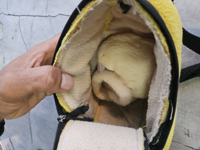 A medium-tan human hand holds an open, yellow and black plush animal carrier