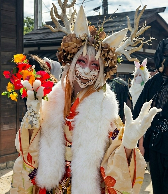 A central individual, positioned outdoors in Kyoto, Japan, displays an elaborate costume. The setting features a traditional Japanese dark wooden building with a tiled roof in the background, along with utility poles and wires, indicating a street or public area. The ground surface is light-colored. The main subject wears a complex ensemble. A headpiece incorporates large, light-colored antlers, two pointed ears, and a central conical element, all adorned with a wreath of brown, dried floral and foliage elements. Beneath, white hair or a wig with streaks of orange/red frames a white mask. The mask features red accents around the eyes and cheeks, and a wide, grinning mouth with numerous sharp, pointed teeth. The individual's eyes are visible through the mask's eyeholes, showing red makeup. The attire includes a light-colored kimono patterned with vibrant red, orange, and purple floral motifs. A long, white, faux-fur stole is draped over the shoulders and down the front, with a red garment visible beneath. Both hands are covered with white, furry gloves resembling animal paws or claws, featuring defined digits. The individual's left hand holds a small bouquet of artificial flowers in shades of red, orange, yellow, and white. The right hand is raised, showcasing the clawed glove. Two other individuals are partially visible in the background. To the immediate right, a person in dark clothing is seen. Further back and to the right, another person wears a white, furry rabbit-like costume with large ears and a colorful head accessory. The scene is illuminated by bright daylight.