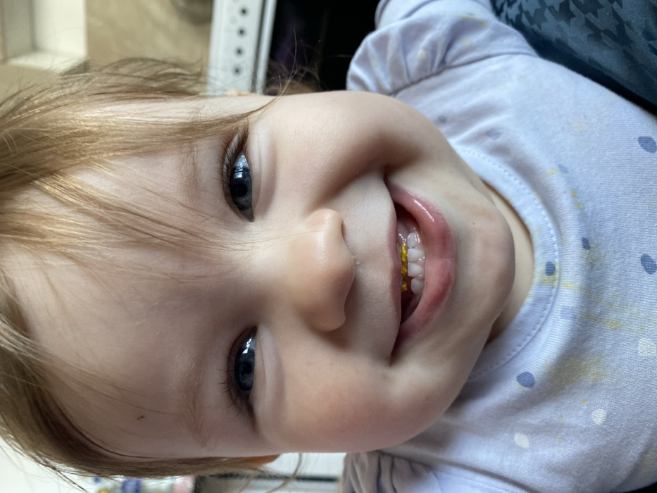 The image displays a close-up, eye-level portrait of an infant or toddler, with fair skin, light brown hair, and blue eyes. The child is looking directly at the camera with a wide, open-mouthed smile, revealing both upper and lower primary teeth. A yellow/gold food substance is present between the child's upper central incisors. The child wears a light purple long-sleeved top with white and dark blue polka dots, exhibiting visible yellow stains, likely from food. The background is blurred, indicating an indoor domestic environment. To the right, a white kitchen appliance, possibly an oven or stove, with dark control knobs is partially visible. A dark, patterned fabric is present in the lower right corner. The location is an unidentifiable residential interior within the city of Unknown, Unknown.