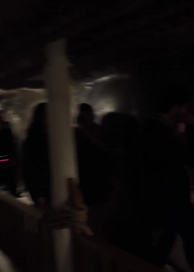 The video depicts a group of people walking along a dimly lit passageway inside what appears to be a cave or underground structure. The walls and ceiling are rough and uneven, suggesting a natural or excavated space. White pillars or supports are spaced along the passageway. A wooden railing runs along one side, separating the walkway from a lower area. People are walking at varying paces. The overall atmosphere seems enclosed and somewhat mysterious.