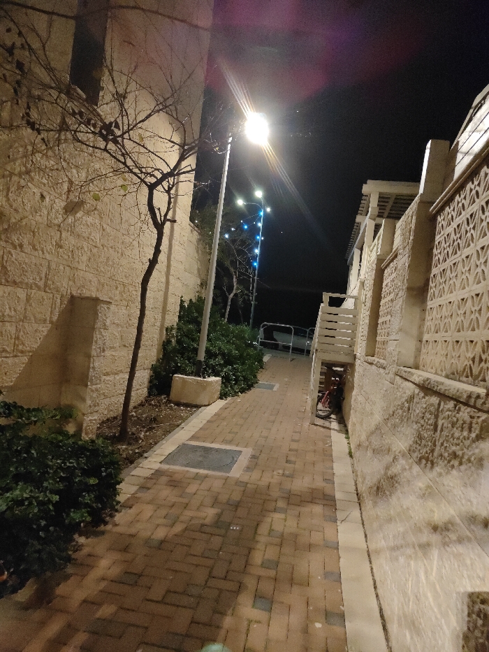 A narrow brick pathway stretches between stone buildings under the night sky. A streetlamp illuminates the path. A bare tree and green bushes flank the left side of the path, while a building with patterned walls borders the right. A bicycle is nestled beneath a staircase on the right side of the path, leading towards a distant street with parked cars and strings of blue lights. The scene captures a quiet urban night.