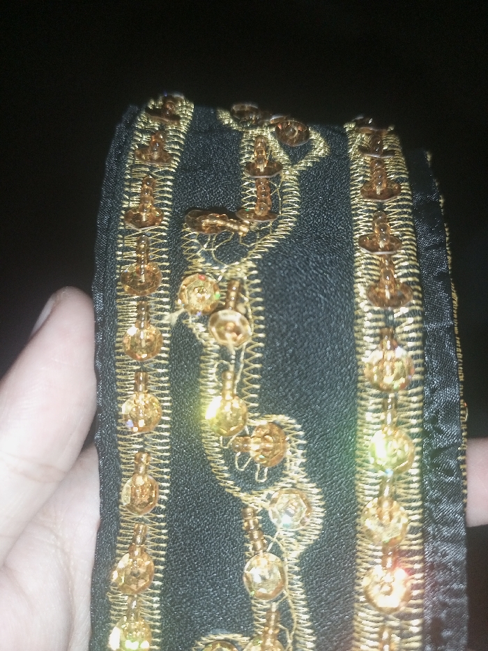 A close-up image displays a section of dark, likely black, textile fabric adorned with intricate gold-toned embellishments
