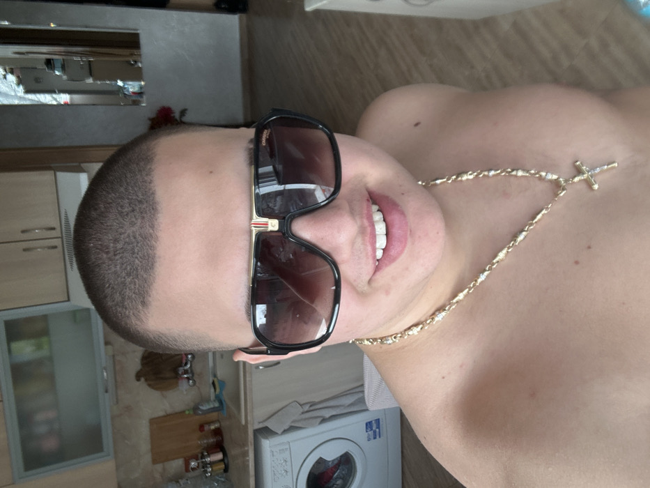 A male individual is depicted in a close-up selfie, captured from mid-chest level upwards, within a residential interior in Ruse, Bulgaria. The subject, a young adult male, has a buzz-cut hairstyle and is shirtless, revealing his upper chest and shoulders. He is smiling, with teeth visible, and has faint stubble above his lip. He wears large, dark aviator-style sunglasses featuring gold accents on the frame and bridge, with the brand "Carrera" faintly visible on the right lens. Around his neck hangs a prominent gold-colored chain necklace, characterized by a textured link pattern interspersed with small reflective elements. A gold-colored crucifix pendant, detailed with white accents on the figure of Christ, is suspended from this chain. The background to the left features a kitchen area. A white front-loading washing machine with blue control panel details is positioned on the floor. Above the washing machine, a kitchen counter holds a sink with a faucet, a wooden cutting board, a bottle (likely cleaning product), and a small rack containing multiple spice jars. Light-colored wooden kitchen cabinets are mounted on the wall above the counter, and a rectangular appliance, likely a range hood, is situated above the sink. The background to the right includes a mirror reflecting an adjacent part of the room. A red object, possibly a decorative flower or plant, is partially visible near the mirror. The flooring throughout the visible areas is light-colored. The reflections in the mirror are indistinct, showing vague outlines of objects and what appears to be a black boot or shoe. The scene is illuminated by ambient light, consistent with an indoor daytime setting.